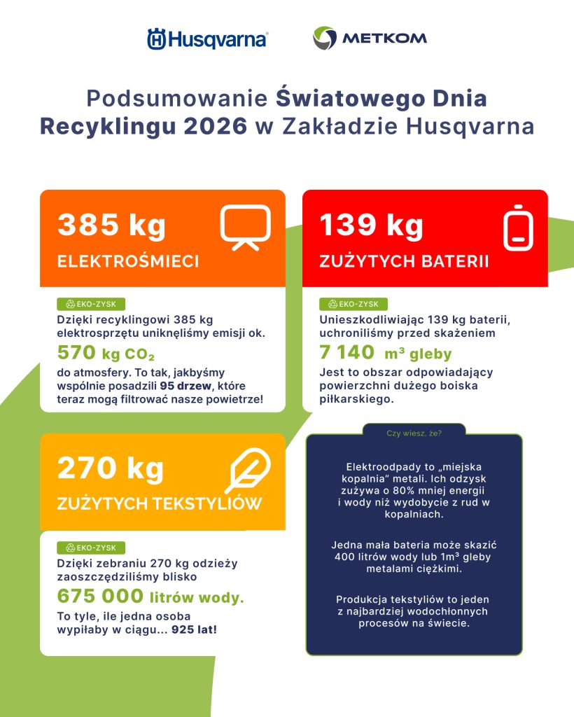 Wspólnie z zakładem Husqvarna w Mielcu udowodniliśmy, że dbałość o środowisko to realne działanie, a nie tylko teoria. Przez cały tydzień (16.03–23.03) prowadziliśmy zbiórkę na terenie zakładu. Pracownicy mogli wymieniać zużyte baterie oraz sprzęt elektryczny i elektroniczny na wiosenne cebulki kwiatowe! 🌷